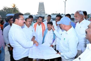 కాణిపాకం జనవరి 20 (గరుడ దాత్రి) కాణిపాకం దేవస్థానం అభివృద్ధి పనులపై మాస్టర్ ప్లాన్ గురించి సోమవారం రాష్ట్ర దేవాలయ శాఖ సీ.ఈ శేఖర్ దేవదాయ శాఖ స్థపతి పరమేశ్వరప్ప లు దేవస్థానం నందు జరుగు అభివృద్ధి కార్యక్రమాలపై దేవస్థానం నందు జరుగుతున్న నిర్మాణ పనులను నూతన అన్నదానం, వినాయక సదన్,తదితర ప్రాంతాలను పరిశీలించారు, మాస్టర్ ప్లాన్ కోనేరు మార్పిడి పై సాధ్యసాధ్యులను పరిశీలించారు,ఈ కార్యక్రమంలో దేవస్థానం ఈ.వో పెంచల కిషోర్ ఈ.ఈ వెంకటనారాయణ, దేవదాయ శాఖ ప్రధాన కార్యాలయ ఈ.ఈ గంగయ్య, భవిరి రవి, ఏఈఓ రవీంద్రబాబు, దేవస్థానం మాజీ చైర్మన్ నాయుడు, ఏ.ఈలు, తదితరులు పాల్గొన్నారు.