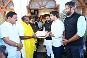 కేంద్ర భారీ పరిశ్రమల శాఖ మంత్రి వర్యులు హెచ్ డి కుమార్ స్వామి గారిని ఆంధ్రప్రదేశ్ రాష్ట్ర విద్య ఐటి ఎలక్ట్రానిక్ శాఖ మంత్రి వర్యులు నారా లోకేష్ గారు ఢీల్లీలోని మంత్రి గారి నివాసంలో కలిశారు అక్కడే ఉన్న గౌరవ పెద్దలు మాజీ ప్రధానమంత్రి దేవెగౌడ గారిని కలిసి ఆయన ఆశీస్సులు తీసుకున్నారు ఆయన ఆరోగ్య పరిస్థితులను అడిగి తెలుసుకున్నారు విశాఖ స్టీల్ ప్లాంట్ పునరుజ్జీవనానికి సుమారు రూ 12 వేల కోట్ల నిధులు విడుదల చేసినందుకు కుమార్ స్వామి గారికి లోకేష్ గారు కృతజ్ఞతలు తెలిపారు అనకాపల్లి వద్ద ప్రవేశం రంగంలో ఎర్పాటు కానున్న అల్సర్ మిట్టల్ నిప్పాన్ స్టీల్ ఉక్కు పరిశ్రమ వల్ల ఏపి యువతకు పెద్ద ఎత్తున ఉద్యోగావకాశాలు లభిస్తాయని ఈ పరిశ్రమ ఏర్పాటుకు కేంద్రం తరపున అవసరమైన అనుమతులను త్వరితగతిన మంజూరు చేయాలని కోరారు ఈ సమావేశంలో కేంద్ర విమానయాన మంత్రి వర్యులు కింజరాపు రామ్మోహన్ నాయుడు గారు మరియు తెలుగుదేశం పార్టీ ఎంపీలు పాల్గొన్నారు