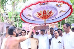 చెన్నై హిందూ మహాసభ ట్రస్ట్ ఆధ్వర్యంలో తిరుమల శ్రీవారికి సమర్పించే వాహనసేవ గొడుగులు, పాదుకలకు చిత్తూరు ఎమ్మెల్యే గురజాల జగన్ మోహన్ నివాసంలో ప్రత్యేక పూజలు నిర్వహించారు. ప్రతి సంవత్సరం హిందూ మహాసభ ట్రస్ట్ ఆధ్వర్యంలో గొడుగులు, పాదుకలు శ్రీపురం శ్రీ నారాయణీ అమ్మవారి టెంపుల్ లో పూజలు నిర్వహించిన అనంతరం.. తమిళనాడులోని పలు గ్రామాల మీదుగా పూజలు అందుకుంటూ తిరుమల చేరుకుంటాయి. యాత్రలో భాగంగా ఆదివారం గొడుగులు, శ్రీవారి పాదుకలు ఆదివారం బీవీ రెడ్డి కాలనీలోని ఎమ్మెల్యే గురజాల జగన్ మోహన్ గారి గృహానికి తెచ్చారు. ఈ సందర్భంగా ఎమ్మెల్యే గారు పాదుకలను తలపై తీసుకెళ్లారు. గృహంలో తండ్రి గురజాల చెన్నకేశవుల నాయుడు తో కలిసి ప్రత్యేక పూజలు నిర్వహించారు. కార్యక్రమంలో తెదేపా నాయకులు పాల్గొన్నారు.