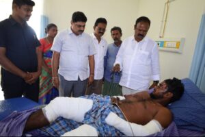 కేవిబిపురం మండలం కాట్రపల్లి ఎస్సీ కాలనీకి చెందిన ఇజ్రాయిల్ అనే యువకుడు గురువారం విద్యుదాఘాతానికి తీవ్రగాయాలై చికిత్స పొందుతున్న బాధితుడిని సత్యవేడు నియోజకవర్గం టీడీపీ ప్రోగ్రామ్స్ కోఆర్డినేటర్ శ్రీ కూరపాటి శంకర్ రెడ్డి గారు పరామర్శించారు. శ్రీకాళహస్తిలోని ఎంజీఎం ఆసుపత్రిలో చికిత్స పొందుతున్నట్లు బాధితుడి బంధువులు ప్రజాదర్బార్ లో విన్న వించుకోవడం, ఆ కుటుంబానికి న్యాయం చేయాలని కోరడంతో వెంటనే ఆసుపత్రిలో చికిత్స పొందుతున్న బాధితుడిని పరామర్శించి ప్రమాదానికి గల కారణాలను తెలుసుకున్నారు. ప్రమాదంలో గాయపడిన యువకుడు కుటుంబానికి ముఖ్యమంత్రి సహాయ నిధి ద్వారా సహాయం చేసేందుకు సిద్ధం చేయాలని మండల తెలుగుదేశం నాయకులను శంకర్ రెడ్డి గారు ఆదేశించా