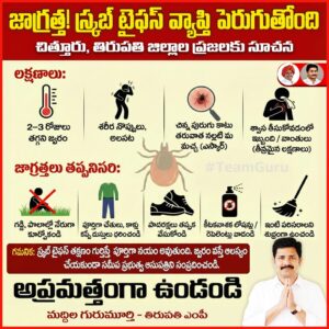 చిత్తూరు, తిరుపతి జిల్లాల్లో స్క్రబ్ టైఫస్ కేసులు వేగంగా పెరుగుతున్న నేపథ్యంలో ప్రజలు, వైద్య శాఖ అత్యంత అప్రమత్తంగా ఉండాలని తిరుపతి ఎంపీ మద్దిల గురుమూర్తి సూచించారు. రాష్ట్రవ్యాప్తంగా స్క్రబ్ టైఫస్ అత్యధికంగా నమోదవుతున్న జిల్లాల్లో చిత్తూరు ముందంజలో ఉండడం ఆందోళనకు గురిచేస్తోందని ఎంపీ తెలిపారు. తిరుపతి జిల్లాలో కూడా కేసులు పెరుగుతున్నాయి కావున ఈ వ్యాధిని నిర్లక్ష్యం చేయకుండా వెంటనే చర్యలు తీసుకోవాలని కోరారు. ప్రతి ప్రభుత్వ ఆసుపత్రి, ప్రాథమిక, కమ్యూనిటీ ఆరోగ్య కేంద్రాల్లో పరీక్షా సదుపాయాలు, అవసరమైన మందులు సమృద్ధిగా ఉండేలా వైద్య శాఖ తక్షణం చర్యలు తీసుకోవాలని ఎంపీ కోరారు.